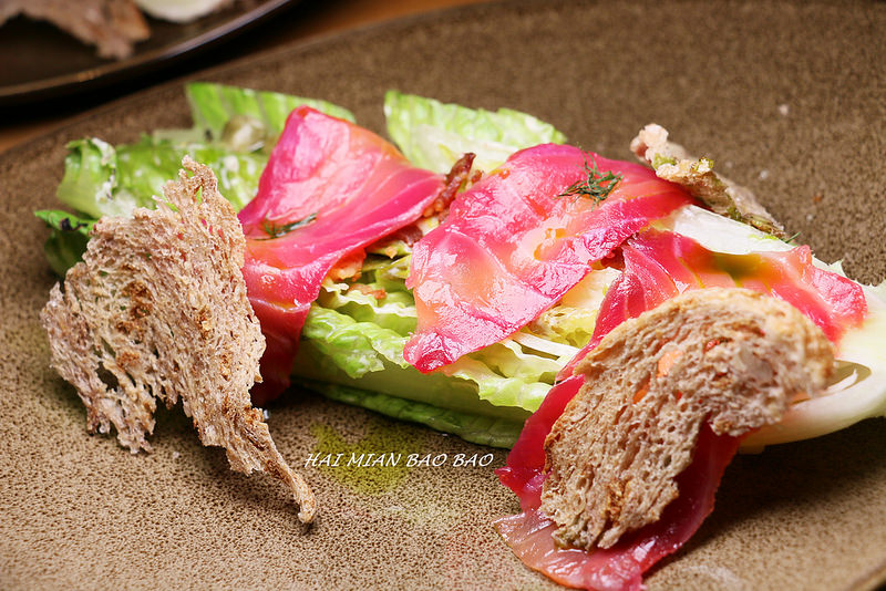 下面襯著培根苞子甘藍溫莎拉及現刨帕馬森起士
