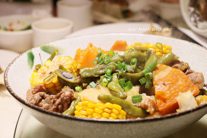 把新鮮的南瓜、玉米、四季豆加上肉