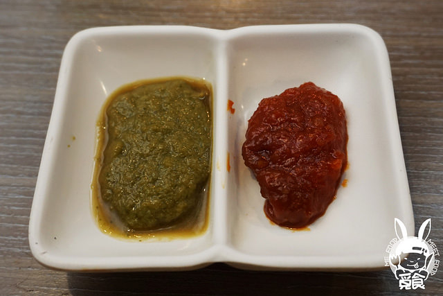 就搭配桌上的沾醬吧 左邊的青醬很適合