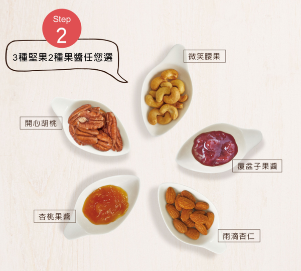 巧達起司+胡桃+繽紛世界;巧克力+覆盆子果醬+夢幻花園;抹茶+杏桃果醬+童話森林;