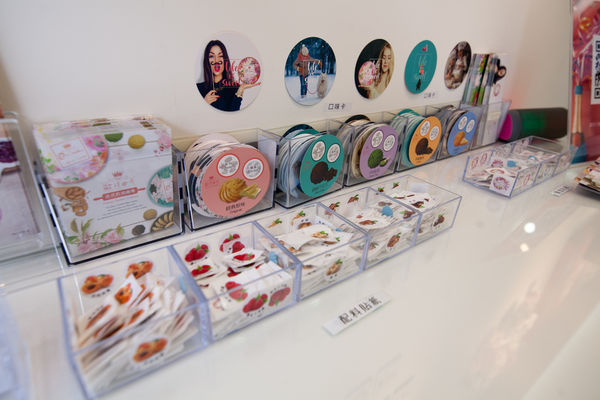 一邊是櫃台、客製化區,另一邊即是琳瑯滿目、色彩繽紛的商品展示櫃。