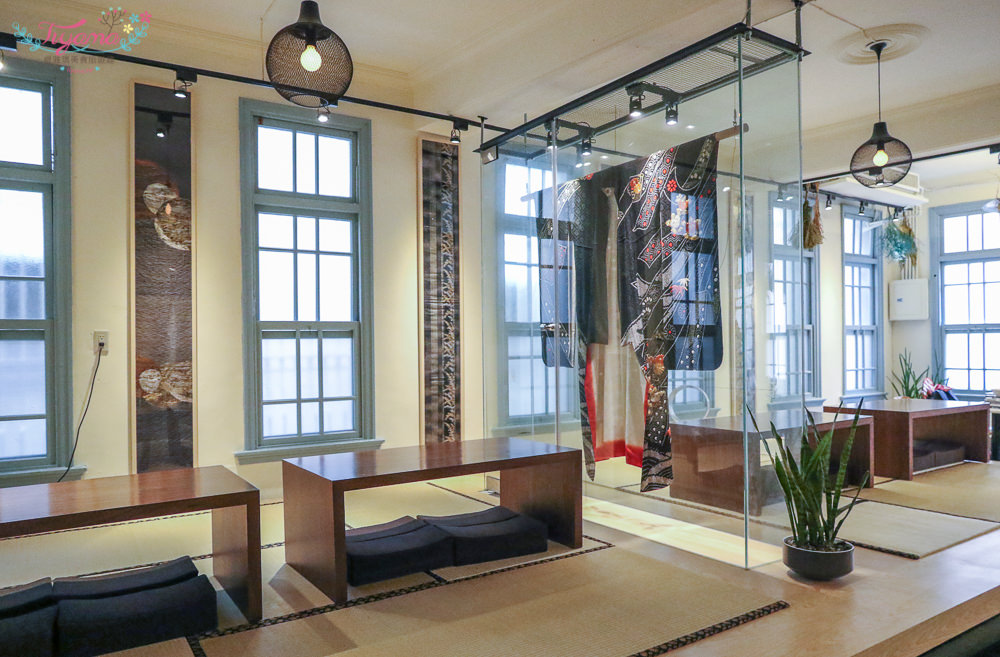 和室鋪上日式榻榻米,中間高掛展示霸氣的黑色系和服