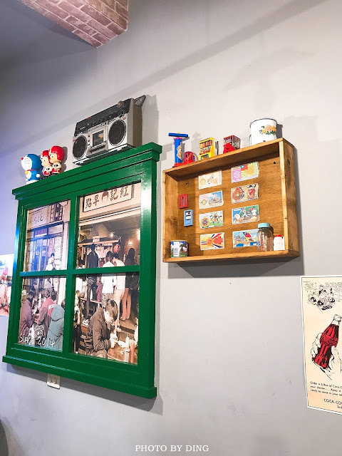 牆壁上有做處理的照片跟一些懷舊的擺飾跟照片