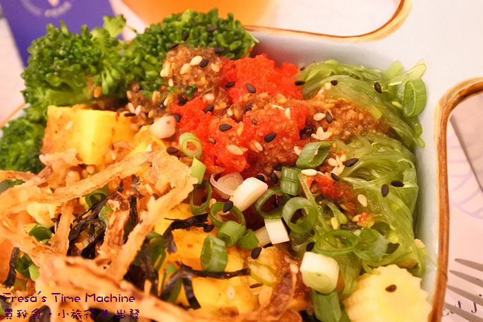 配料有毛豆、魚卵、玉米、蟹肉沙拉、海帶絲.