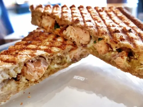 印上完美格紋的熱壓吐司,裏頭厚厚的雞肉跟快要溢出的橙色起司超誘人。