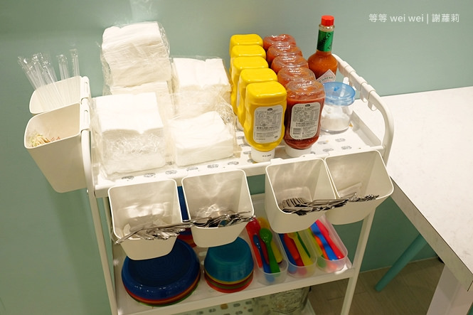 小桌檯提供餐具、調味瓶及紙巾,有需要的朋友都可以自行取用,這邊不另外收取服務費,下面也有提供一些兒童餐具,不過如果要帶小朋友來可能就要評估一下,因為這邊目前還沒有提供嬰兒座椅呦!