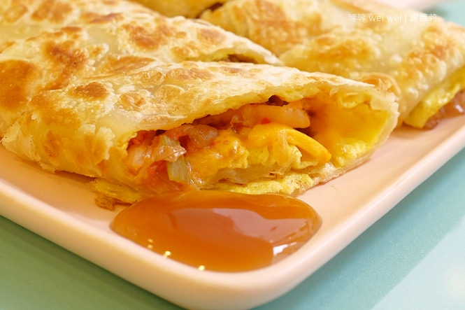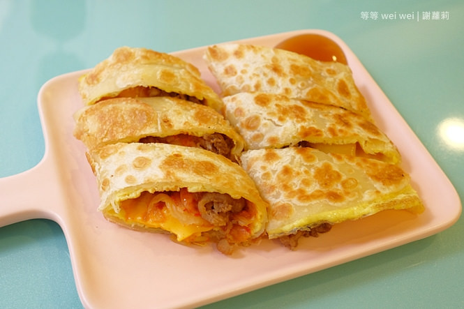 薯餅起司蛋餅,每次看到菜單上有,我都會有一種忍不住想點的衝動,餅皮酥脆偏硬,香氣還不錯,可惜口感有點過硬,它還蠻像是蔥油餅的外皮,是屬於有厚實的嚼勁,整體來說也是一般般,自己會比較喜歡剛才單點的泡菜燒肉。