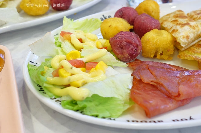 沙拉淋上黃芥末醬,帶了些微甜、又有些酸口,吃來清爽又開胃,附餐中最亮眼的大概就是它的麻薯球,口感跟地瓜球很像,Q彈而兼具著酥脆口,這個表現不錯。