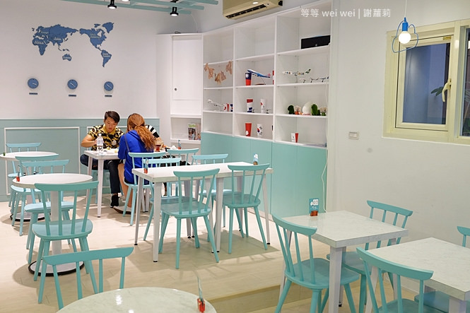 不光光只有門口,其實它裡面的環境也蠻吸引人的,延續著大門帶來的淺藍色調,再加上陽光微微灑落的美感,待在裡面用餐其實是一種很舒服的享受。
