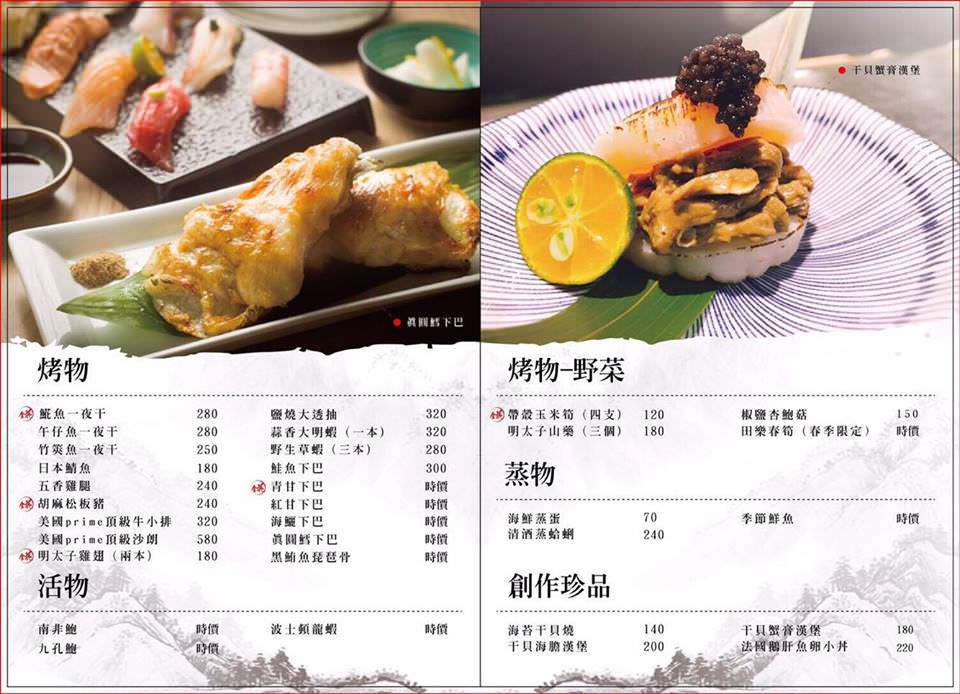 錵鑶日本料理菜單: 生魚片、握壽司、烤物、沙拉等都有,如果想要吃特別的,就能品嘗看看無菜單料理!台中價位分別為 1200、1800 (詳情請洽粉絲團)