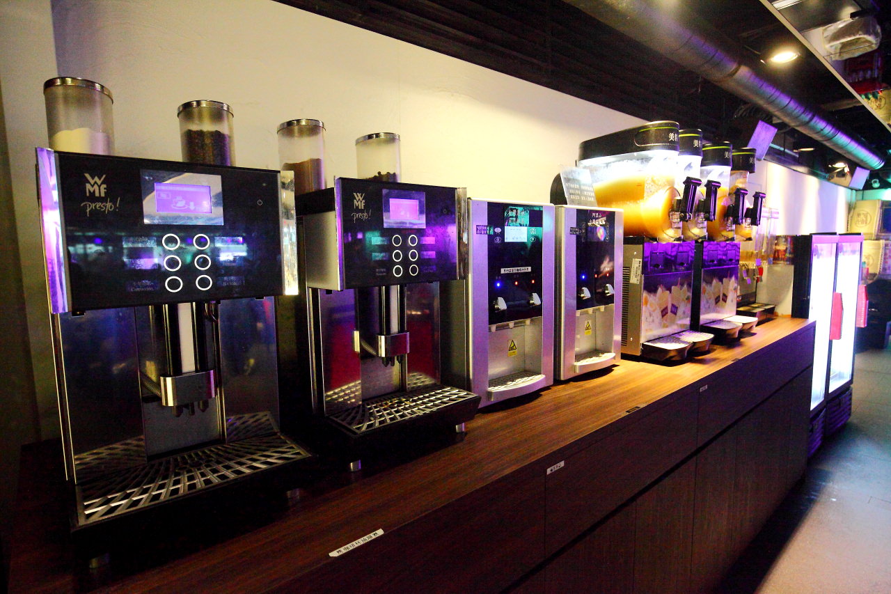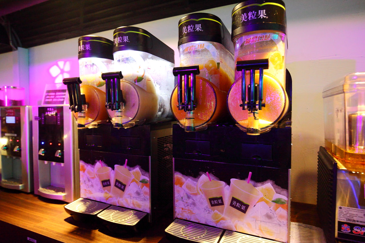 飲料區,有罐裝的果汁汽水、雪泥、研磨咖啡等多種飲料,接無限暢飲