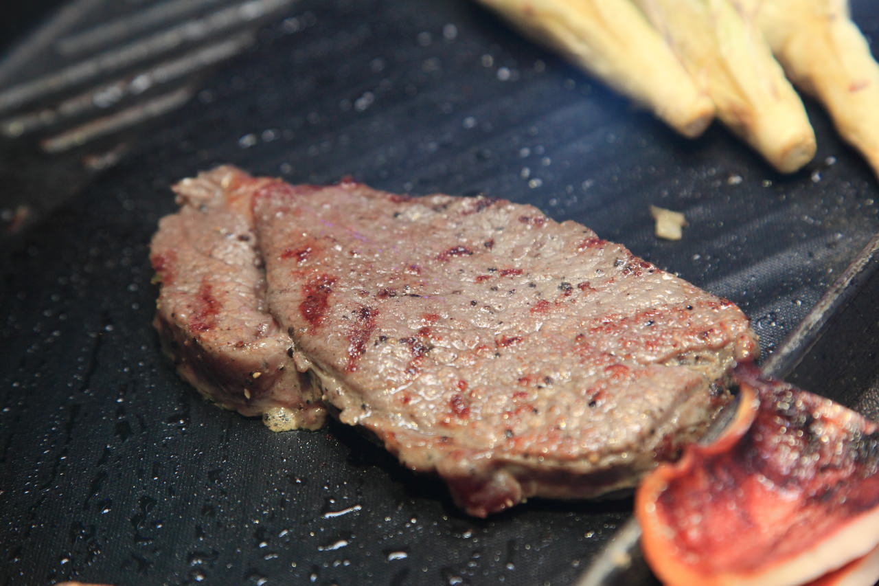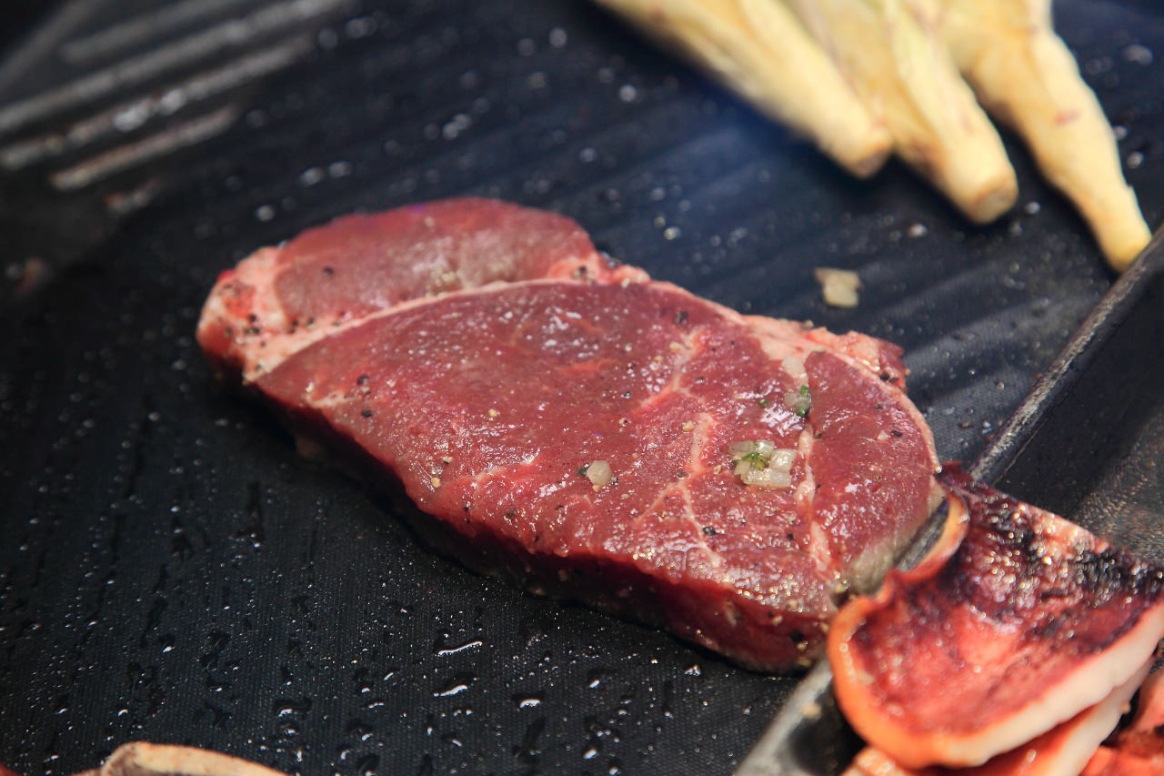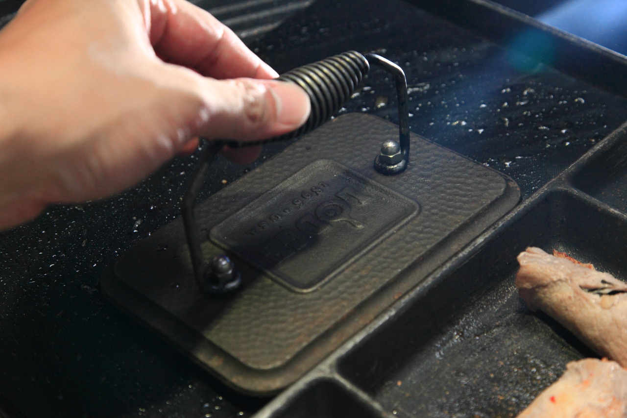 像是帶骨牛小排,帶骨牛小排真的很難烤,因為帶有油筋的關係,邊烤就邊翹,翻也不是壓也不是,這時就出動壓肉板吧!