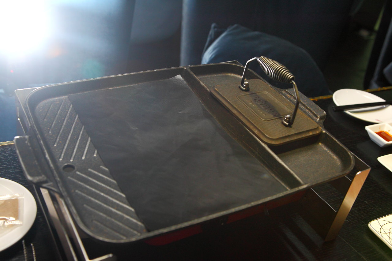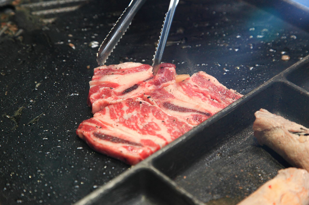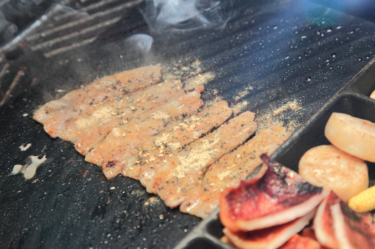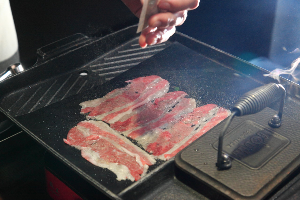 烤盤是不沾烤盤,像牛五花片這樣油脂豐厚的肉類也不用擔心怕像用一般烤網會沾黏,再不會烤肉的人也可以輕鬆的烤好