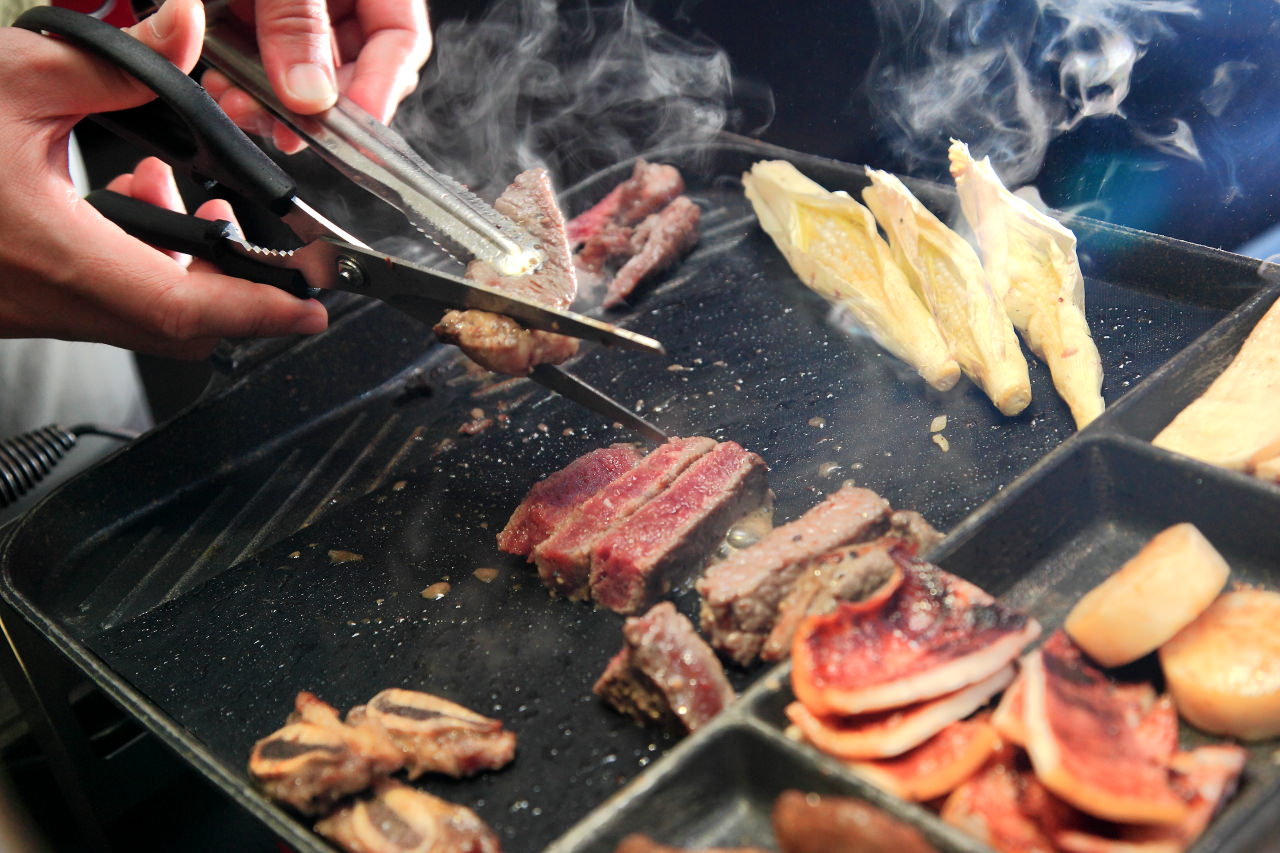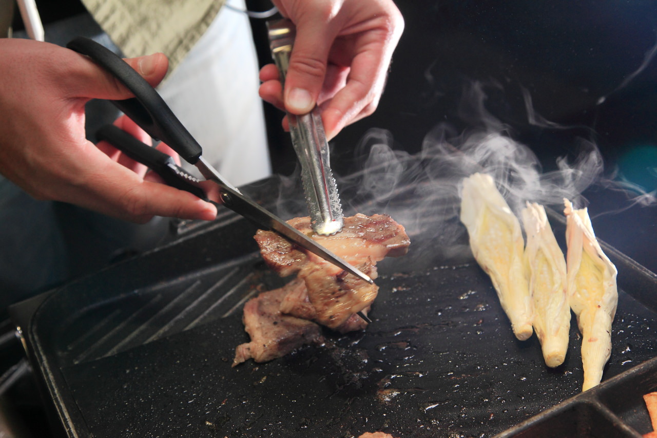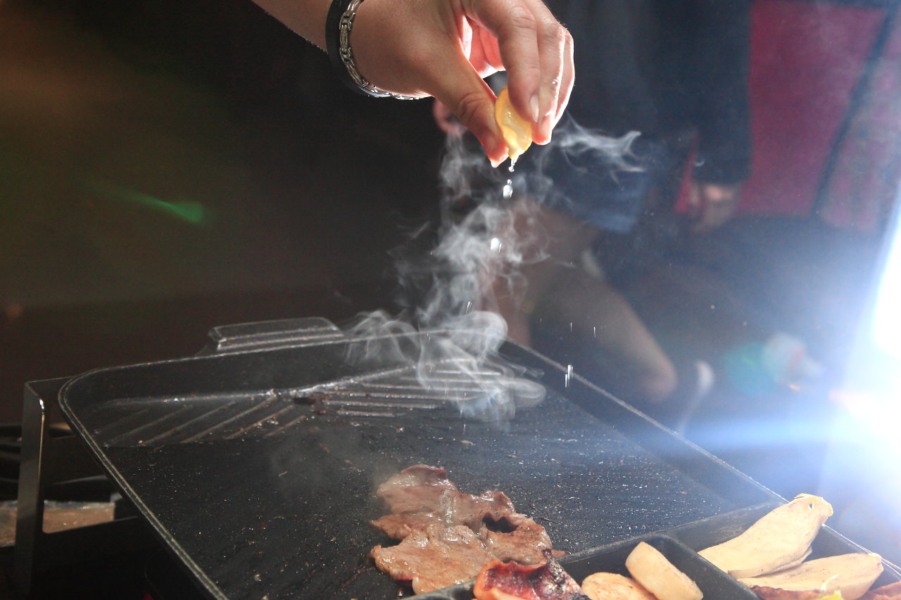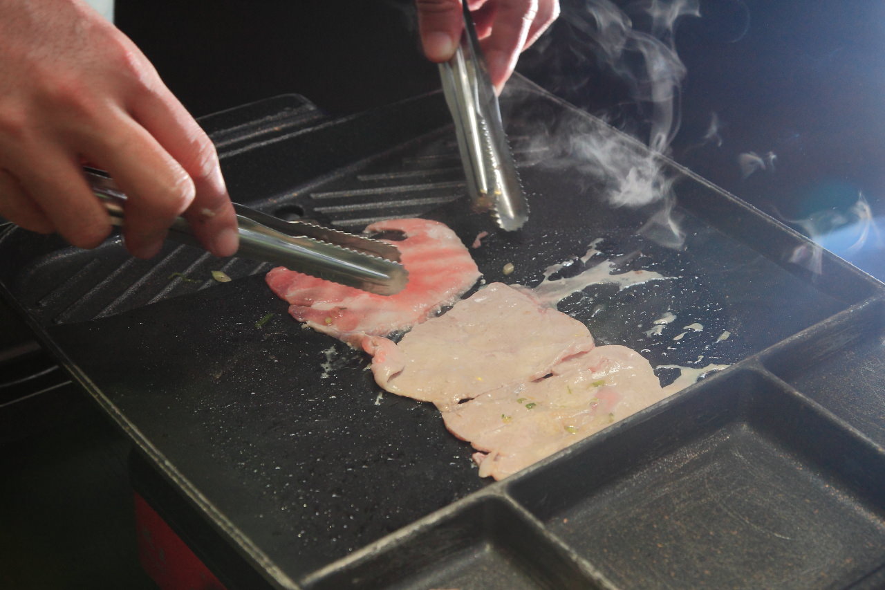 烤盤是不沾烤盤,像牛五花片這樣油脂豐厚的肉類也不用擔心怕像用一般烤網會沾黏,再不會烤肉的人也可以輕鬆的烤好