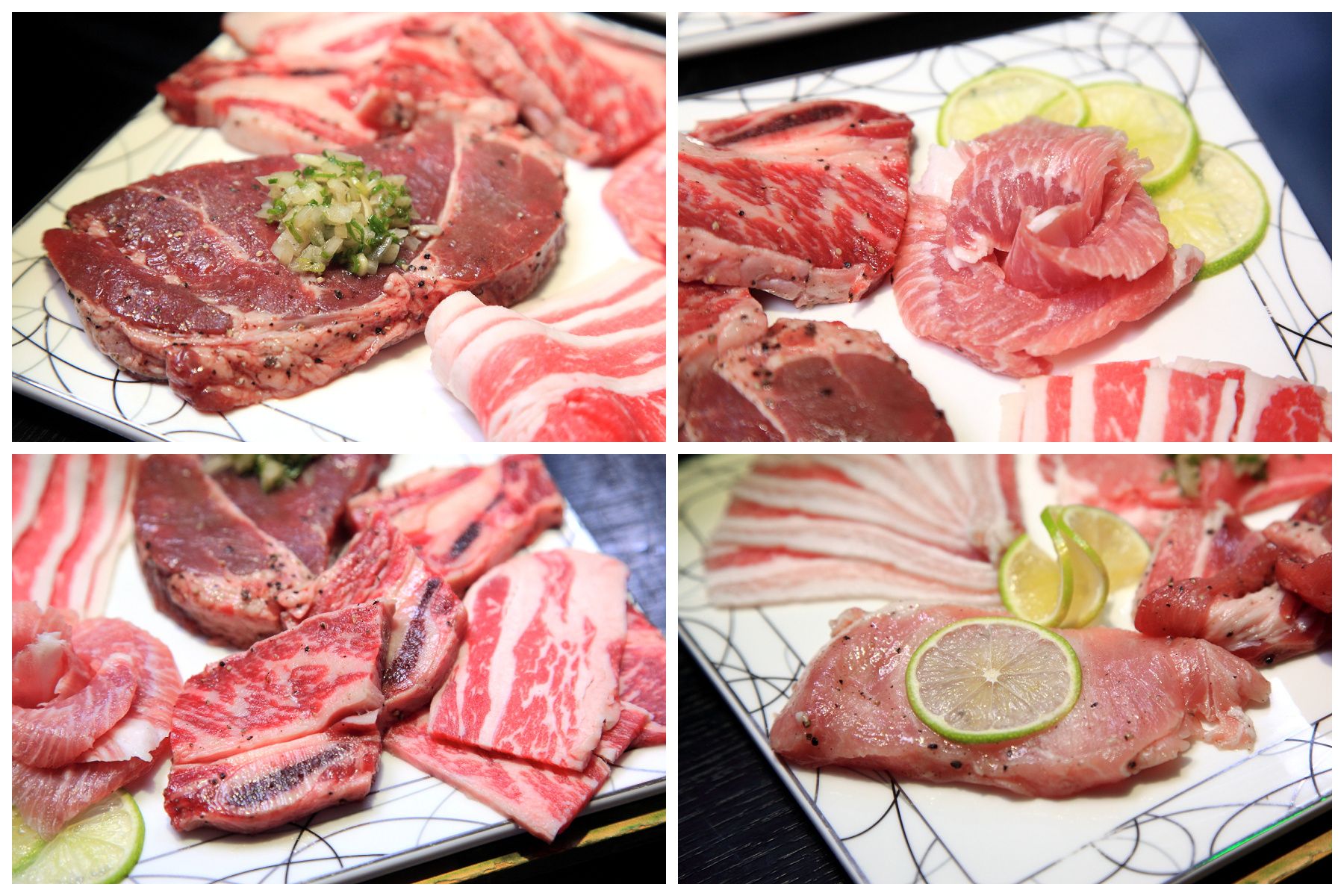 基本肉盤,牛五花、松阪豬、沙朗牛排、帶骨牛小排、里肌豬排等二十餘種肉品全部無限續點吃到飽