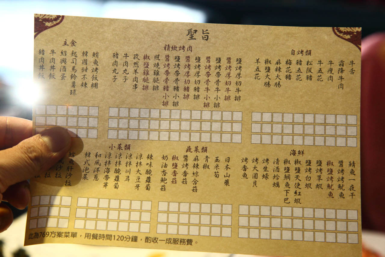 皇上吉饗極品唐風燒肉的消費方式是一人$769(含啤酒暢飲)用餐兩小時吃到飽,另外還有$599的無酒精專案唷,所有食材皆媲美頂級單點式的菜色呢,今天咬咬&151選的是769方案,這張聖旨菜單上的餐點通通可以點,(小提醒:右下角的海鮮類是攻略重點^^”)