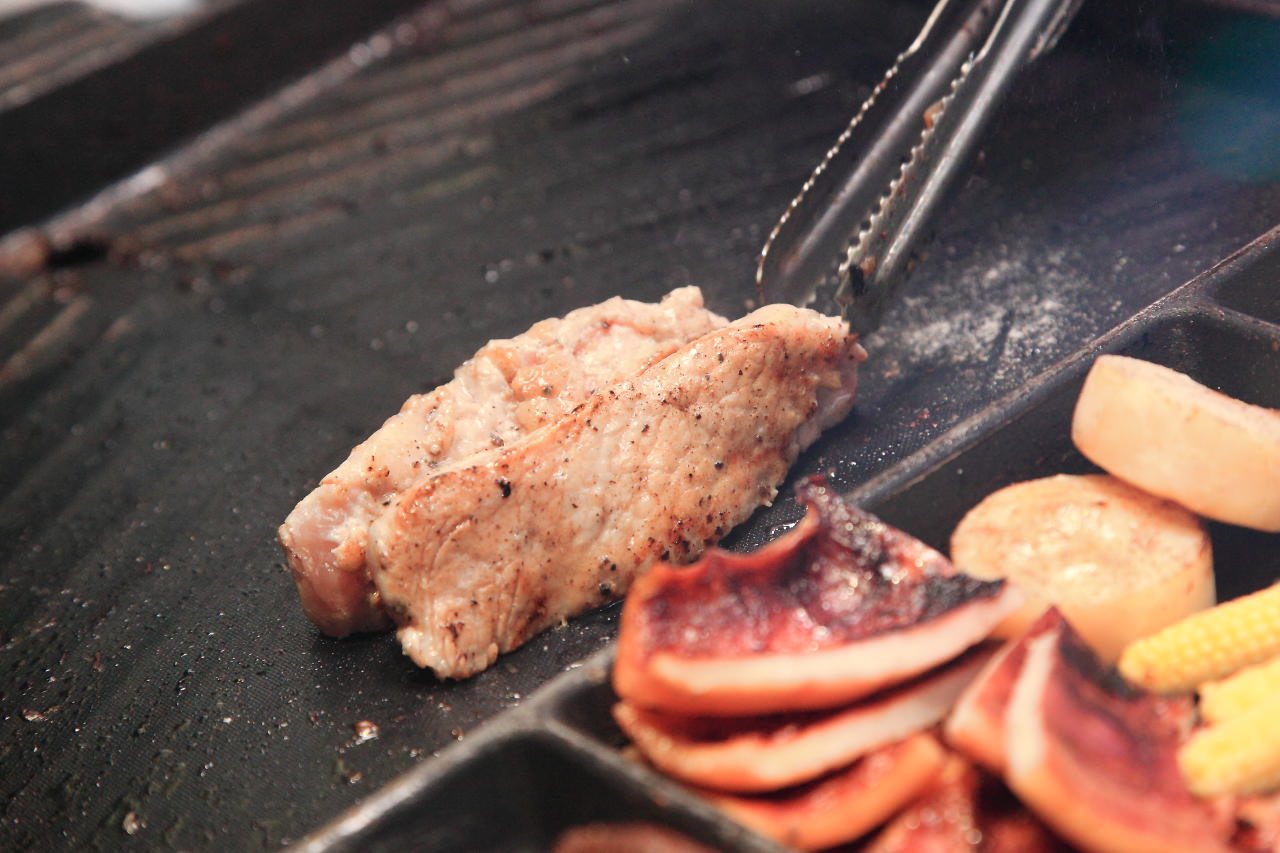 里肌豬排,使用口感軟嫩多汁的里肌豬排,烤法跟牛排亦同,只是切忌豬肉一定要烤全熟唷,兩面烤的焦香之後剪開,再加上自己喜好的調味料在鐵板上烤至全熟
