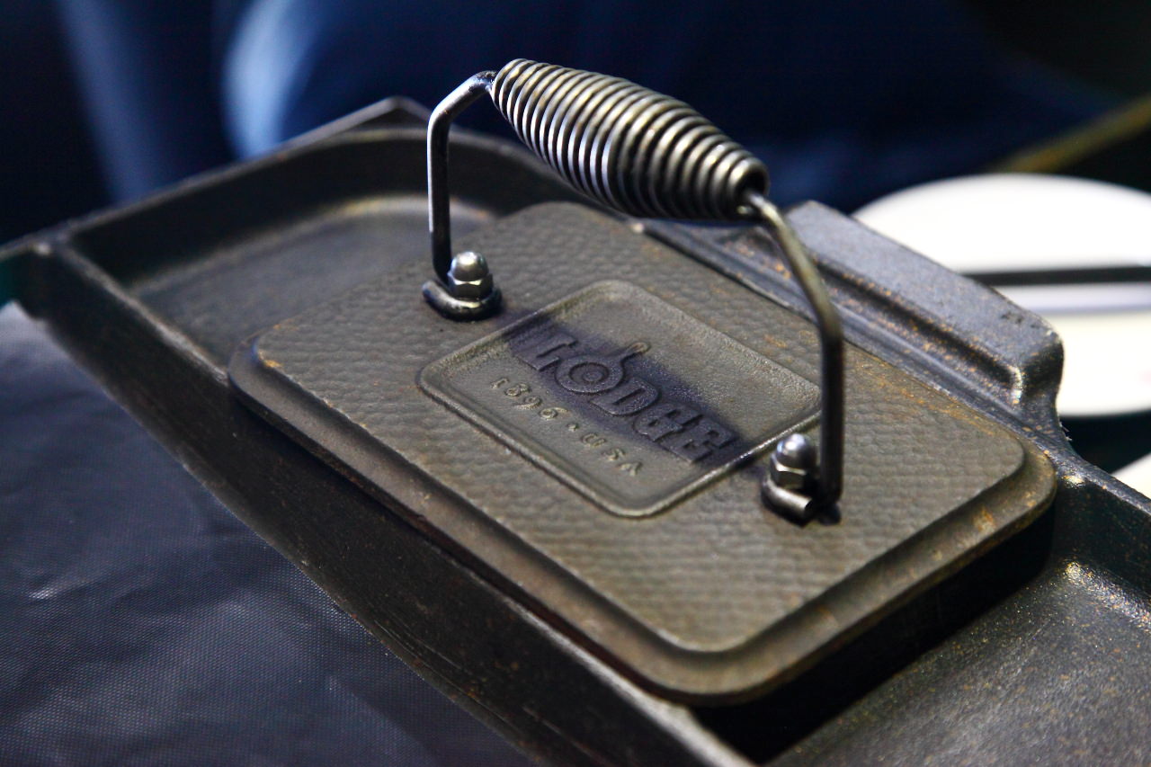 還有一個小壓板,相信很多人在燒烤時都曾遇過這樣的困擾,稍微厚一點的肉有時候邊烤就邊翹,邊翻邊烤還要壓,受熱很難均勻,有了這個壓肉板,只要往肉上放上去,就可以輕鬆地把肉烤的超漂亮的