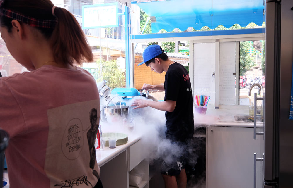 老闆正在利用 液態氮+原材料去製作分子冰淇淋