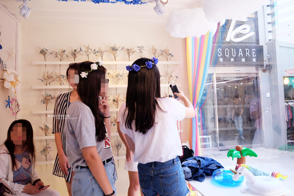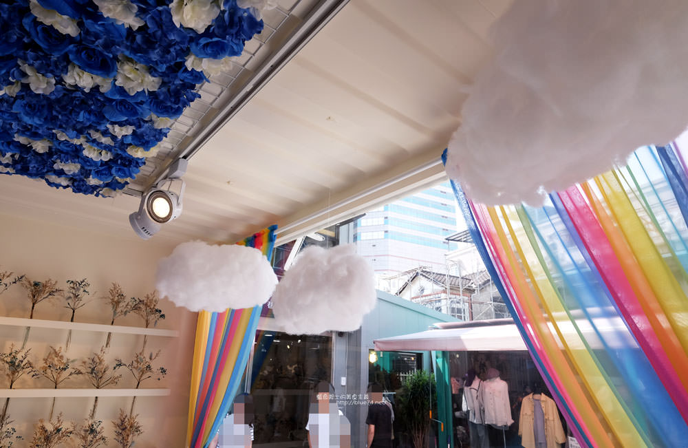 半透明箱子裡,擠了店家的工作台,以及網紅最愛的拍照處,有乾燥花、雲朵和彩虹簾子