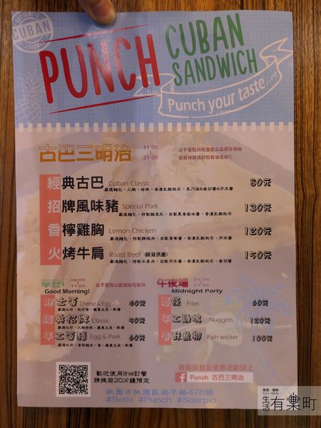 外帶或內用都可以直接點,黑板上有菜單可以參考。古巴三明治有四種口味,分別有經典古巴、風味豬、香檸雞胸和烤牛肉,四種口味感覺都不錯,價格約是80元到150元。另外還有提供早餐和小點,餐點有限供應時間,像是早餐餐點只供應到上午11點喔。