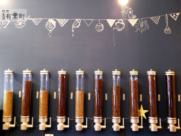 店內的空間屬狹長型,面積還蠻大的,燈光昏黃與深色牆面互映,呈現沉穩氛圍,牆面上還擺置了咖啡豆牆,好有質感的設計,一眼就吸引我的目光。