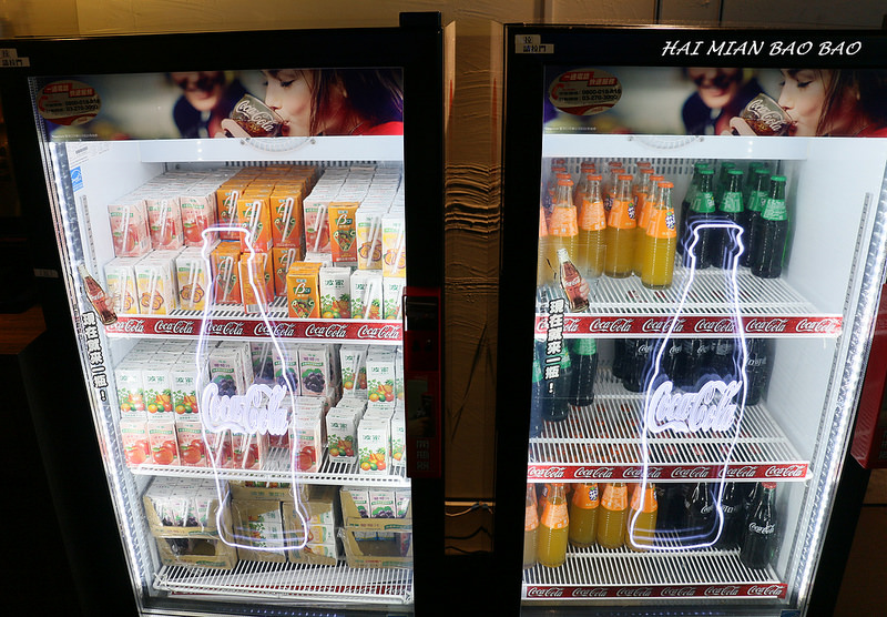 旁邊的冰箱有鋁箔包果汁及玻璃瓶汽水