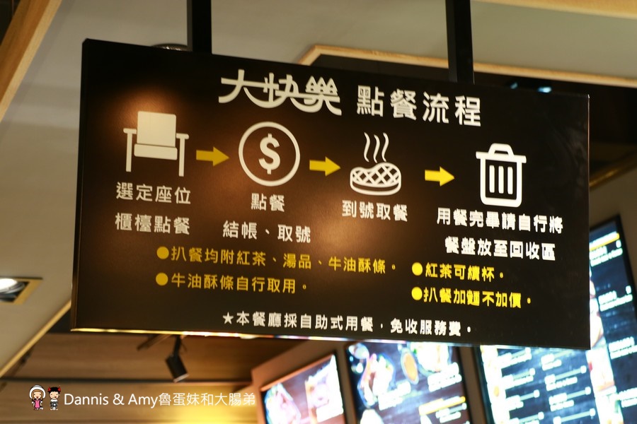 先選好桌位(有座位就坐)→櫃台點餐結帳取號碼→號碼亮燈號可以取餐→用餐完把餐盤放到回收區