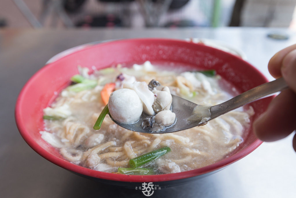 這一碗海鮮湯麵,用料豐富澎湃,有蛤蜊、花枝、水煮蛋、鮮蚵、白蝦、虱目魚肉、豬肝以及肉絲。