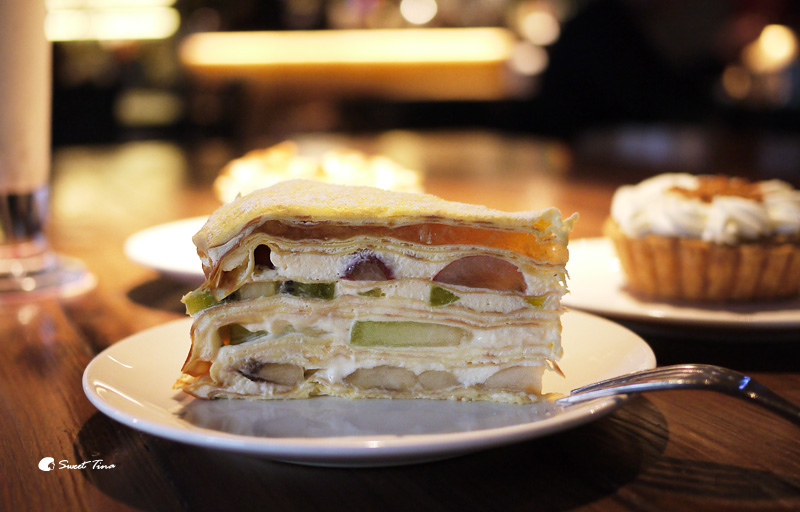 水果千層蛋糕 - 透過光可以看見層層堆疊的蛋皮及水果,裡頭可是使用了20層蛋皮再搭配當季的水果,種類相當豐富,吃起來也特別清爽不膩口,也因做工繁複,所以是每日限量供應。