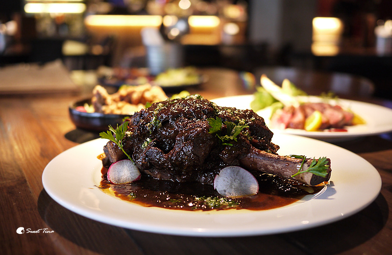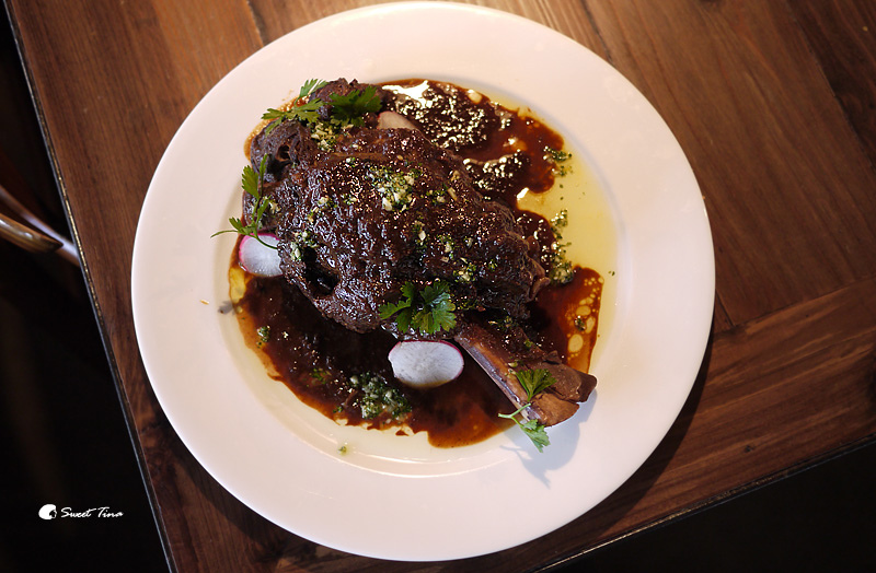 紅酒燉牛膝佐Gremolata - 以紅酒、焦糖、洋蔥燉小牛膝,製作過程中不加任何一滴水,燉煮出牛膝豐富膠質的口感。