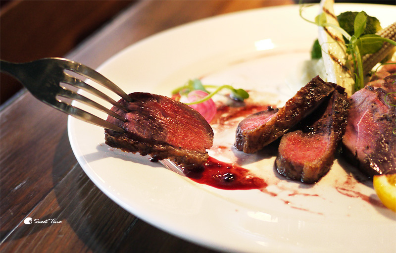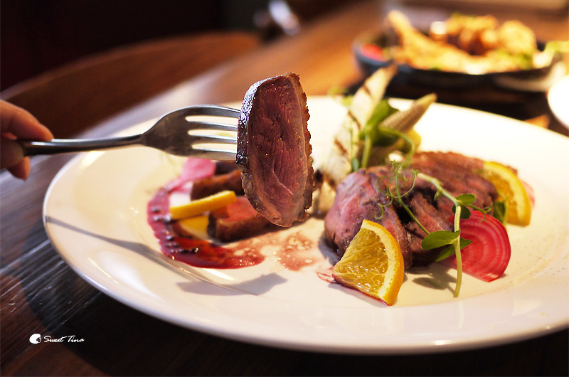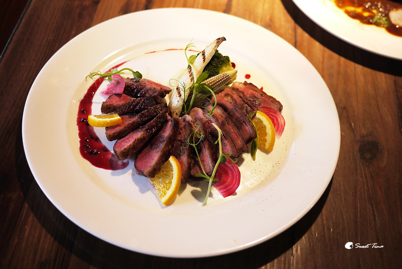 脆皮法式櫻桃鴨胸佐波特酒莓果醬 -特選花蓮玉里的優質櫻桃種鴨,並將鴨肉熟成4-5天,讓肉質更加熟成軟化,烹調後的櫻桃鴨胸呈現出皮酥肉嫰的口感。