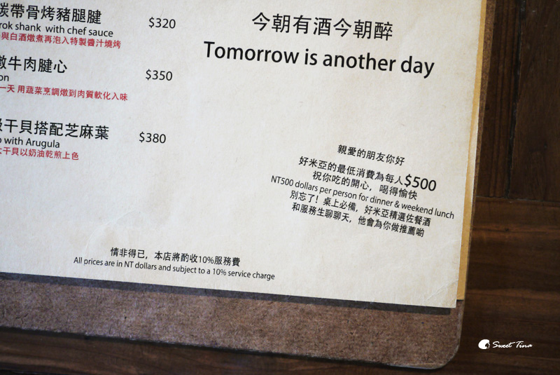 因為是餐酒館,所以店家提供的酒類滿多的,搭配著餐點一同享用一定超棒的,除了單點的選擇,也有推出商業午餐、套餐、下午茶,選擇滿多樣化的,詳細的菜單內容可以參考好米亞的粉絲團(菜單內容),低消為每個人$500,下午茶時段則為一杯飲料。