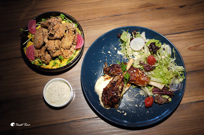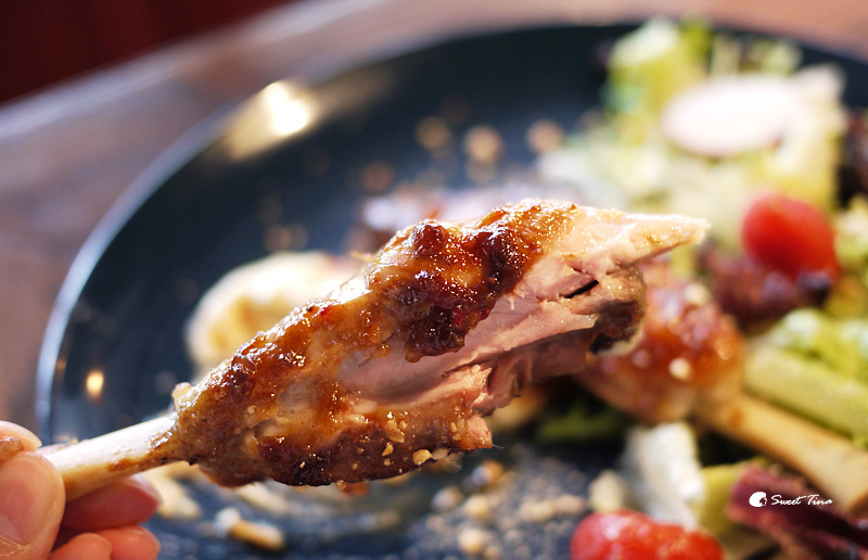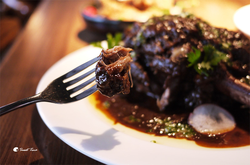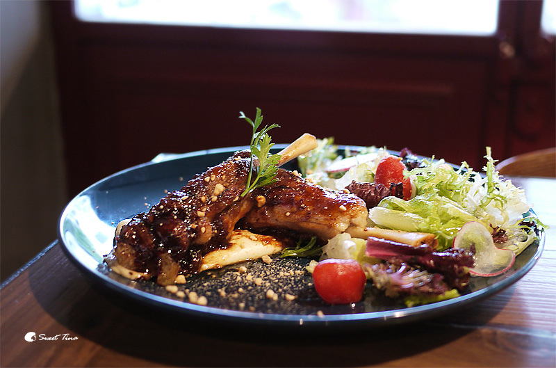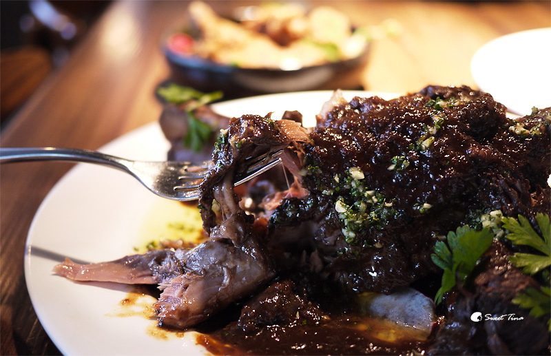 祕製醬汁碳烤豬腿腱 - 豬腿腱採用蔬菜高湯與白酒燉煮後再加入祕製醬汁燒烤,所以肉只要輕輕一撥就開了呢,搭配上帶有甜味的醬汁,咬下後的香氣會讓人回味無窮。