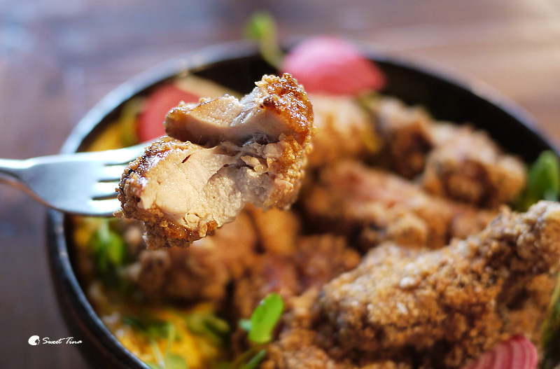 他奶奶的卡啦雞佐茶葉蛋塔塔 - 除了酥炸雞腿肉,底下還有舖上一層煎蛋,煎蛋吸飽了雞肉的香氣,吃起來也特別的美味。