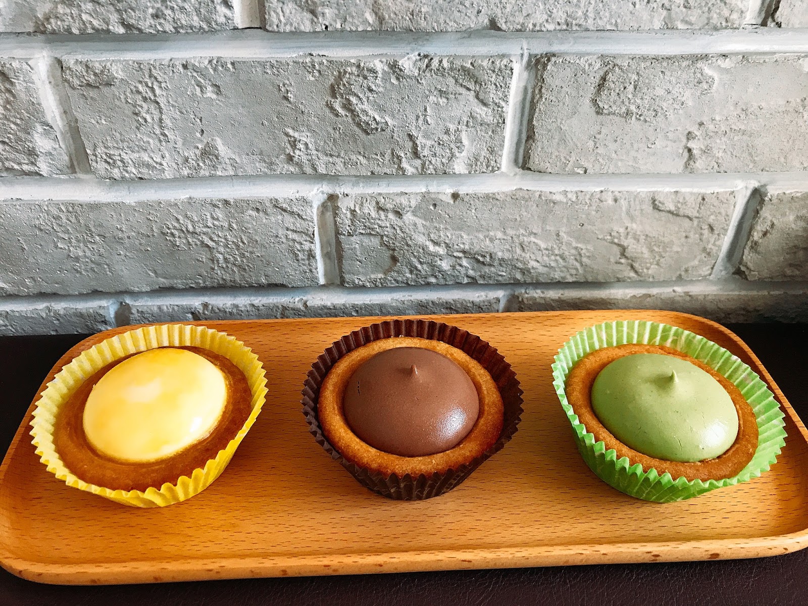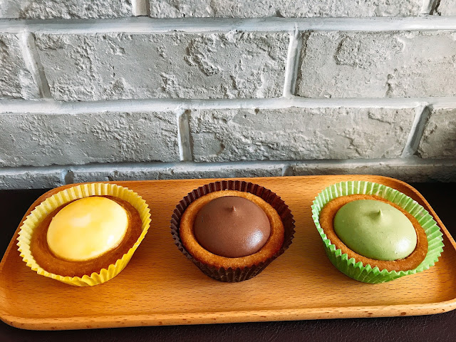 有三種口味的乳酪塔(原味/抹茶/榛果巧克力)