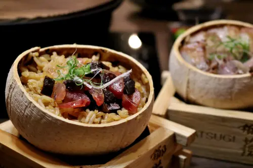 椰子蒸飯有臘味、鹹豬肉、香菇雞