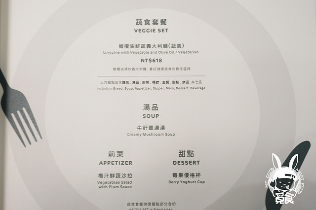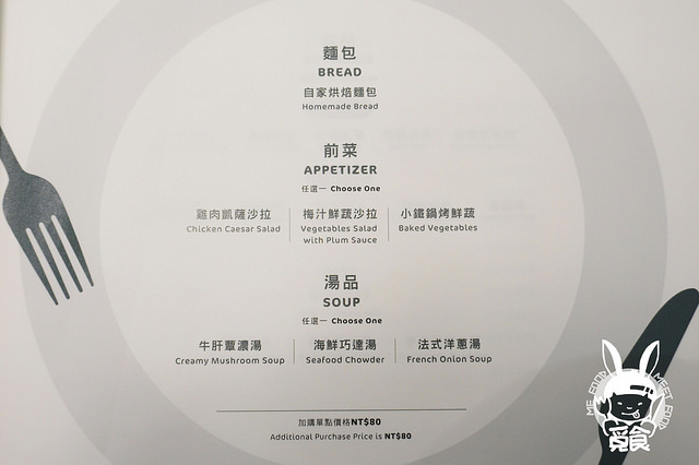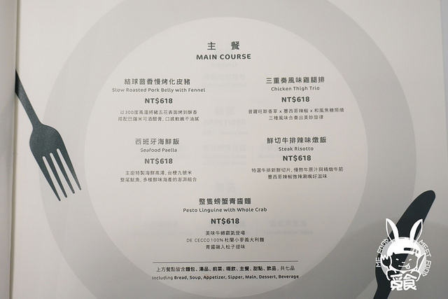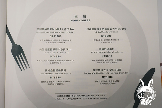 主打從前菜 麵包 湯品 啜飲 主餐 甜點 到飲料 共七品的完整套餐形式