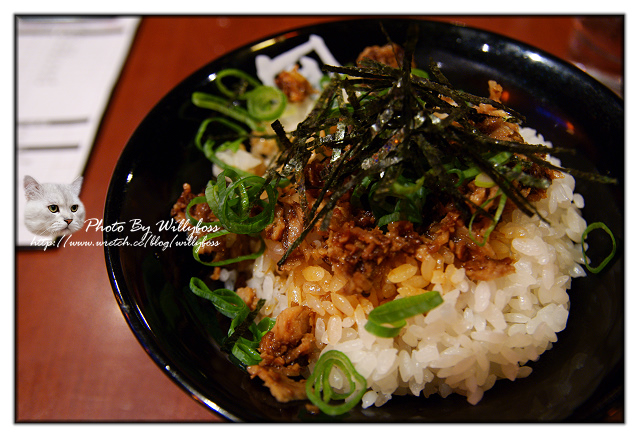 蒜香豬肉飯,其實只有大概巴掌大小小一碗,但飯盛得還挺尖的,吃起來蠻像什麼蒜香口味的魯肉飯,只是醬汁沒有那麼多,搭配上蔥花和海苔其實挺對味的,整體稍乾了些,加點拉麵湯感覺好吃多了。