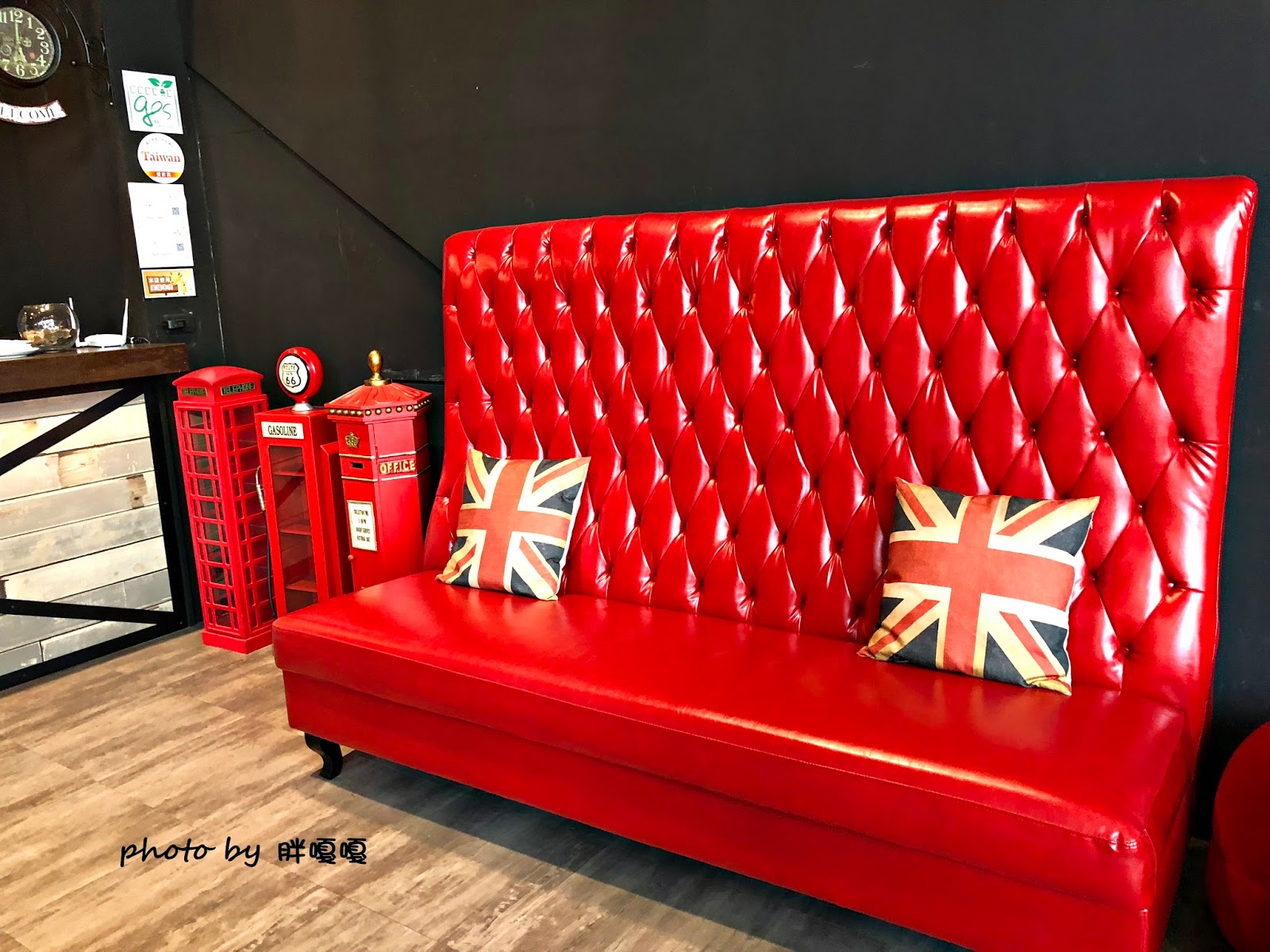 在櫃檯旁的鮮紅拉釦沙發和招牌顏色相互輝映