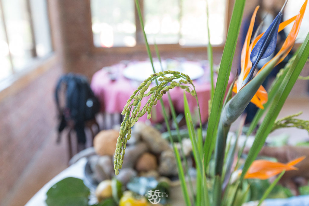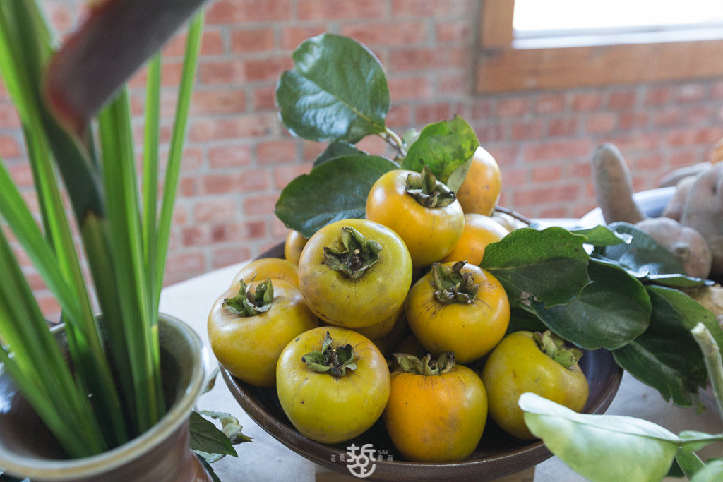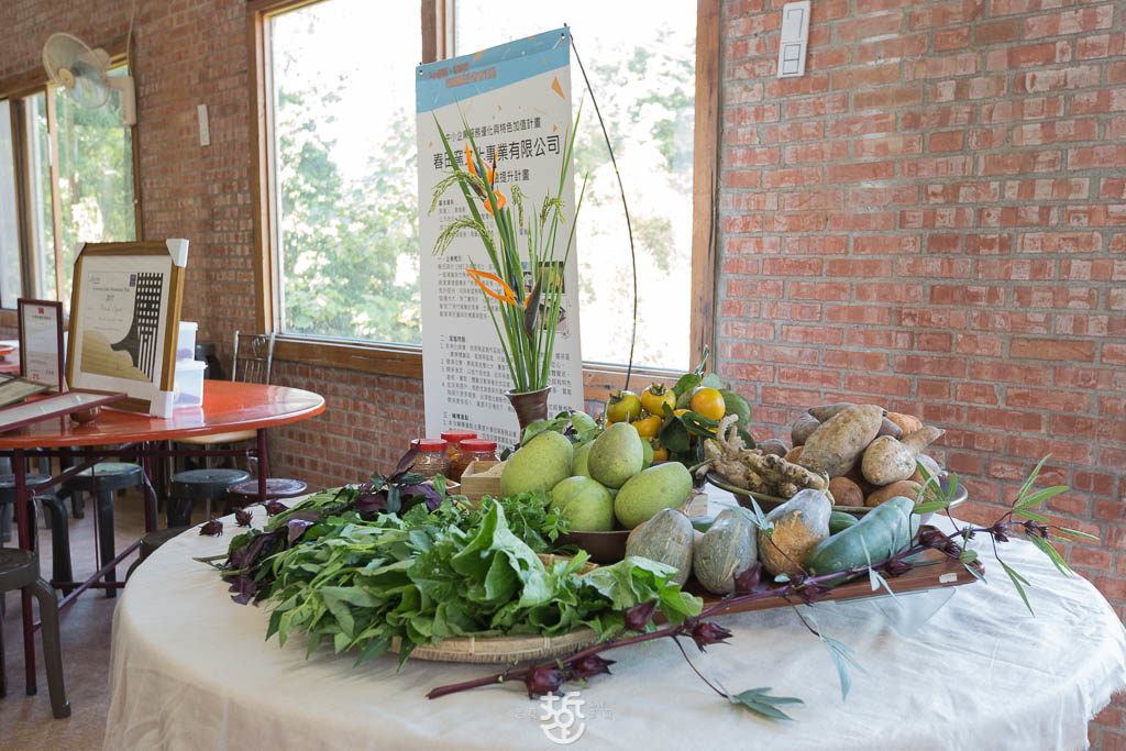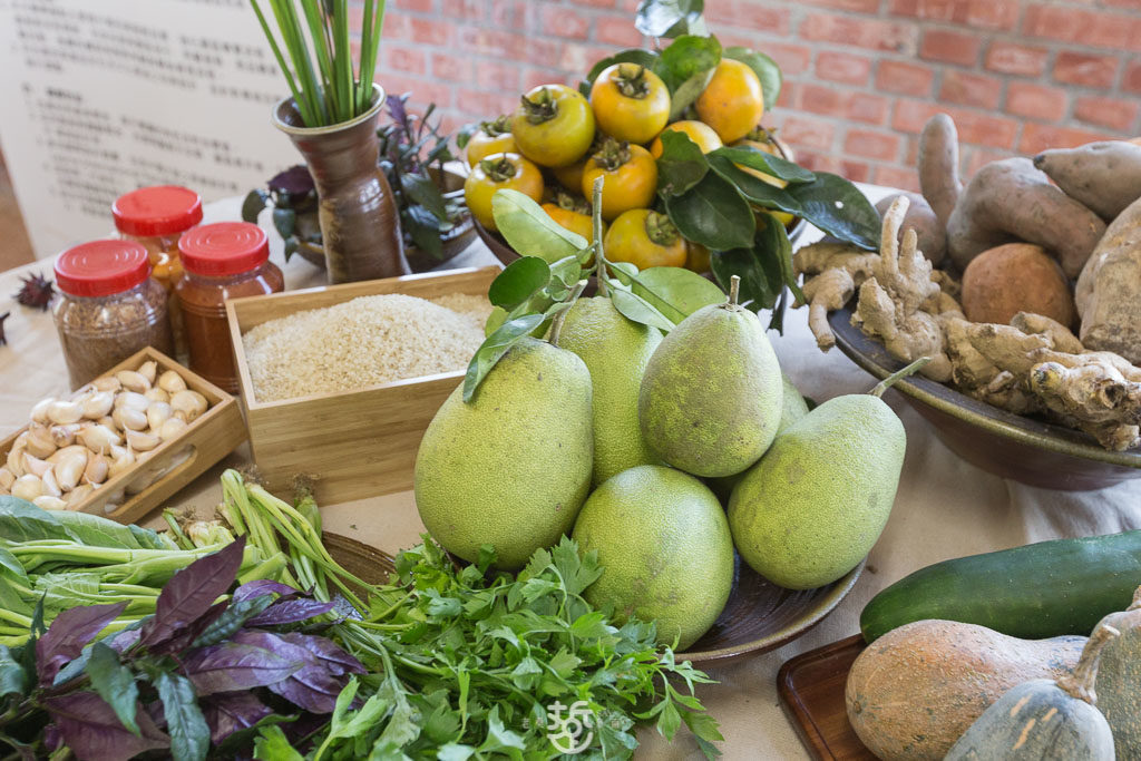 桌上陳列著得獎事蹟、獎狀。另一桌則展示稻米、季節蔬菜、水柿、蒜頭、洛神花、柚子、薑以及地瓜等等,餐廳的蔬果食材幾乎都是自種的。