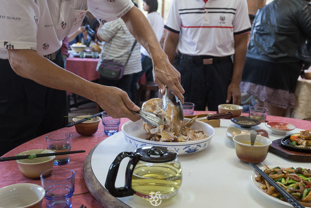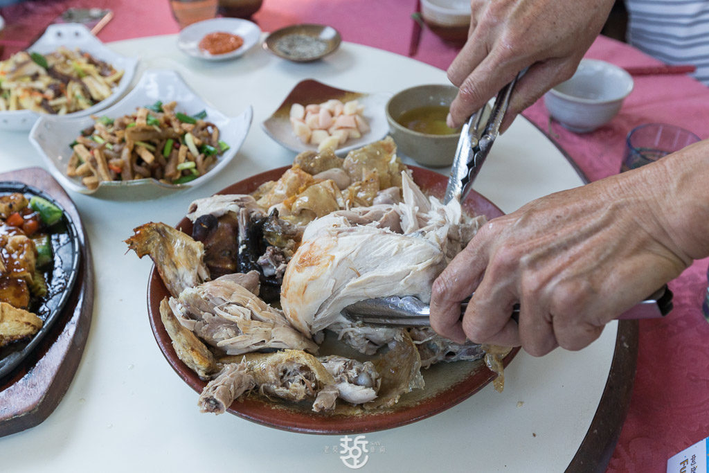 用木柴捨棄瓦斯烤出的雞,味道就是不同。雞皮烤得金黃酥脆,肉汁美味完整的被鎖住。一端上桌,由順伯當場表演一手『手扒雞』,咻咻兩下,一隻雞被大卸八塊。