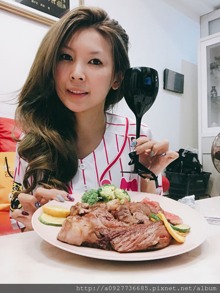 牛排整個大到可以完全遮住滾媽的臉。