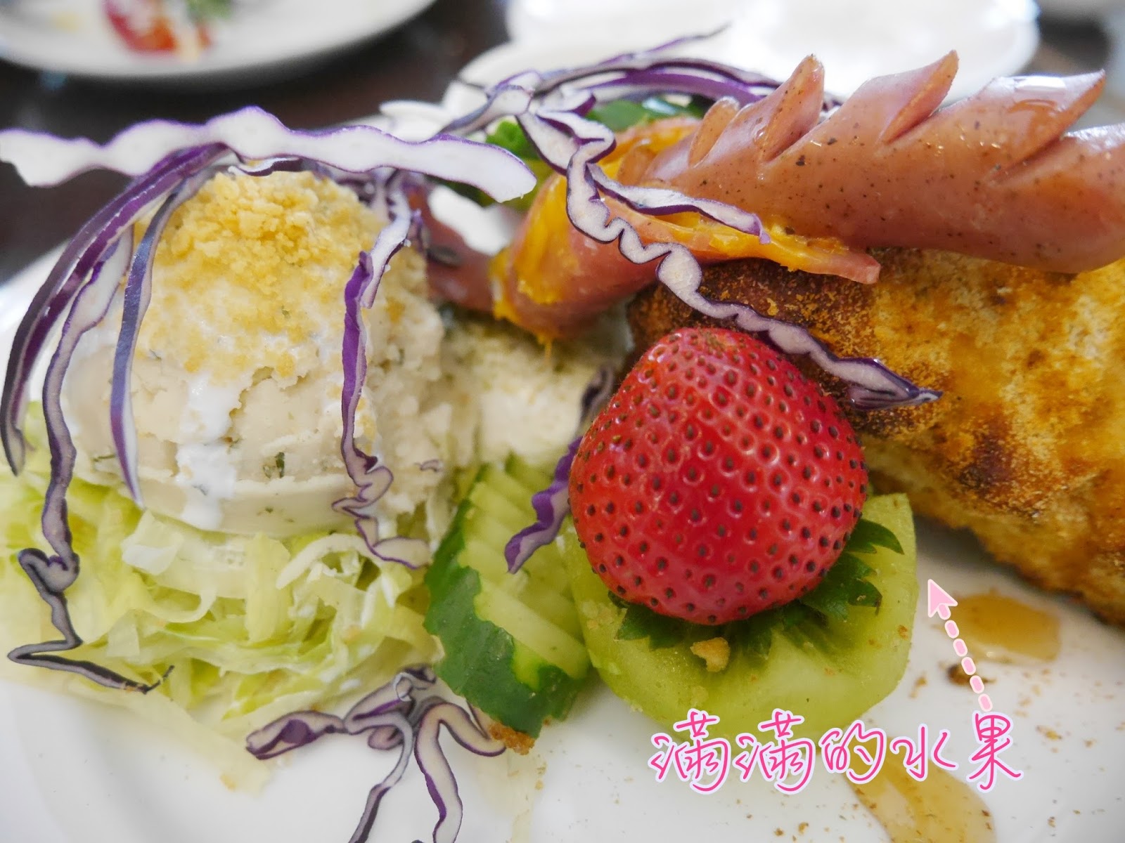 側邊附有馬鈴薯沙拉 與水果沙拉