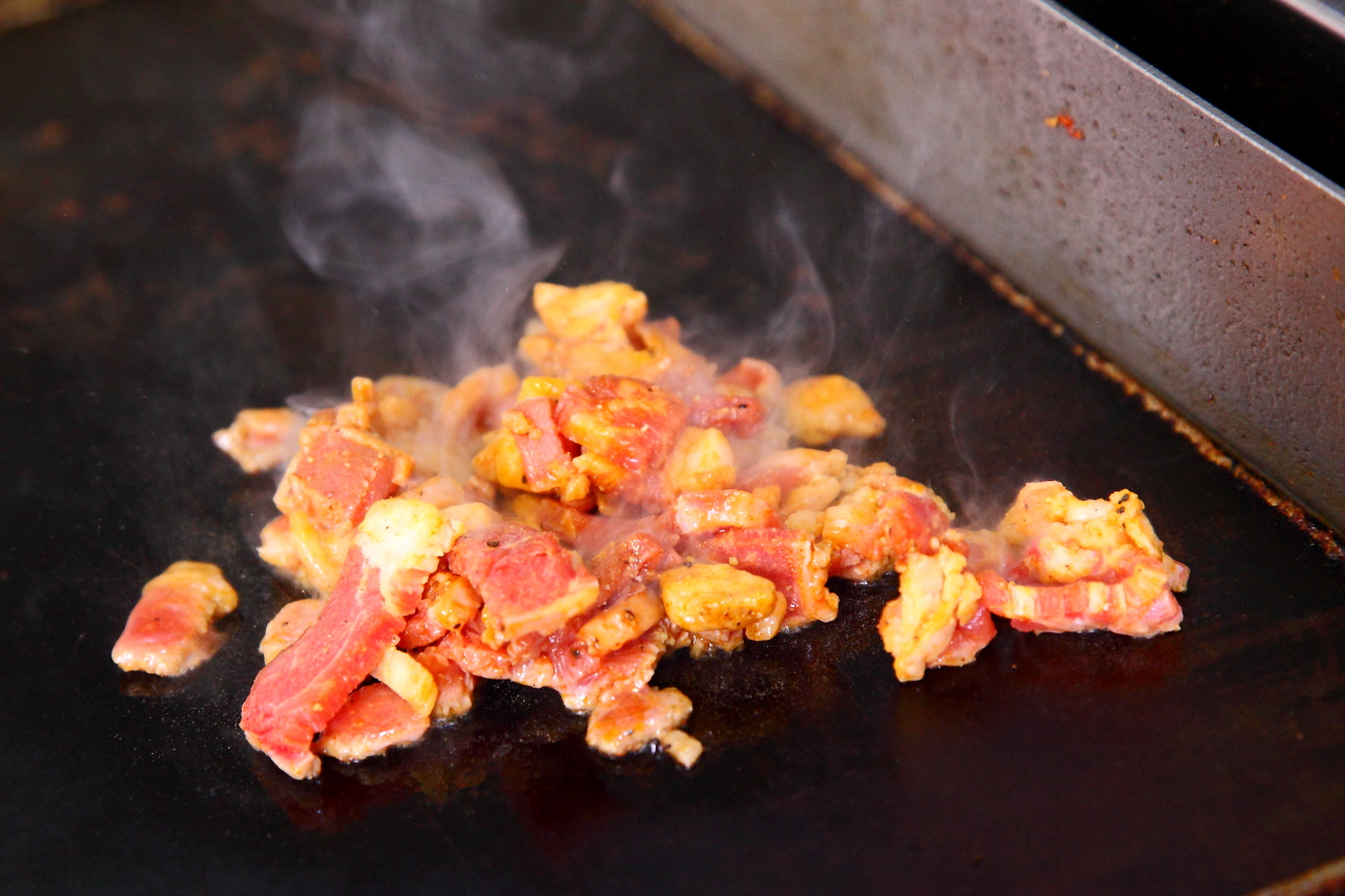 肉類有兩種選擇,牛肉跟雞肉,點餐之後才會上鐵板上炒,咬咬選的是牛肉,牛肉一接觸到鐵板馬上散發出一股烤肉香,這樣的肉量是一人份,超澎派!