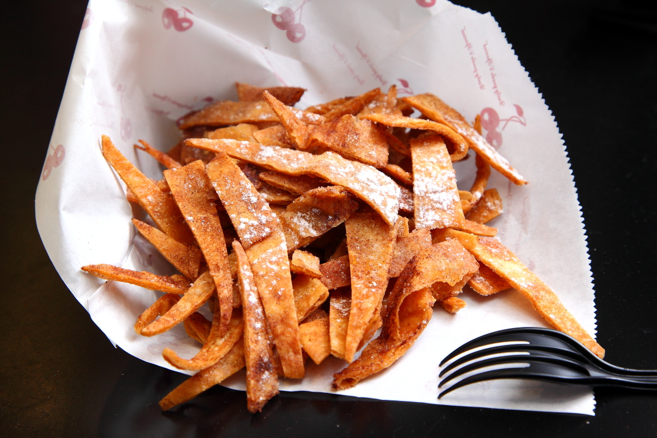 是用薄餅去炸,起鍋後在撒上如雪花般的細糖粉跟肉桂,炸起來的薄餅相當酥脆,不油膩還帶股麵香,搭配上肉桂香及糖粉的甜,口感相當平衡,讓人越吃越涮嘴呢