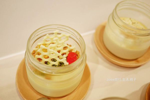 迷迭香蜂蜜口味是外面較少見的甜品口味,入口即可感受到濃濃蜂蜜風味及淡淡的迷迭香香氣,上面舖蓋著的蜂巢造型白色巧克力是甜點師傅自行製作,在視覺上也加分不少。