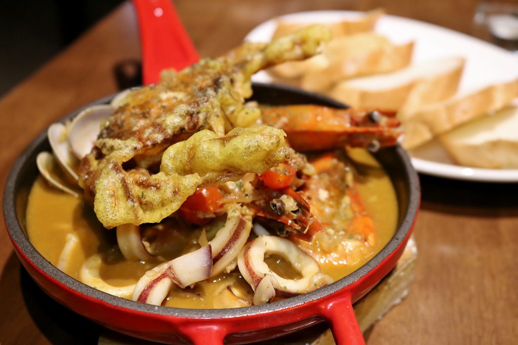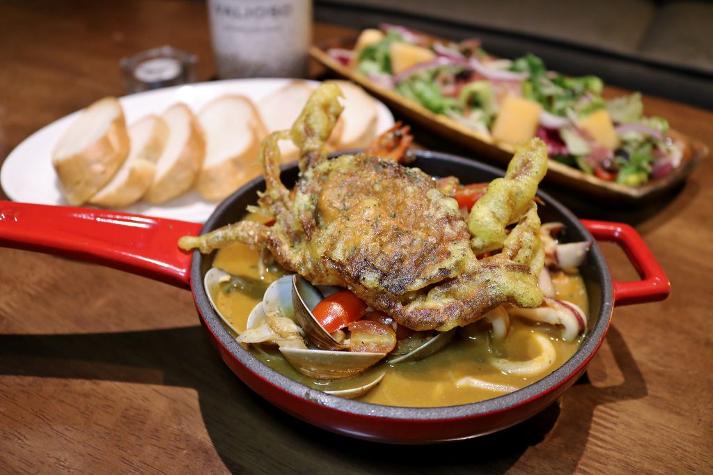 整隻的軟殼蟹霸氣登場,蝦子已貼心的去殼留頭尾,滿滿花枝跟蛤蠣相當澎湃,不過最讓人陶醉的還是底下濃郁到極致的蝦蟹膏湯,整道菜的精華所在,搭配麵包,下酒菜首選!