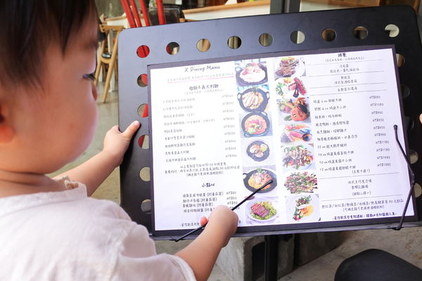 這就是門口的簡易菜單,阿捲將高度放下讓寶寶看菜單,