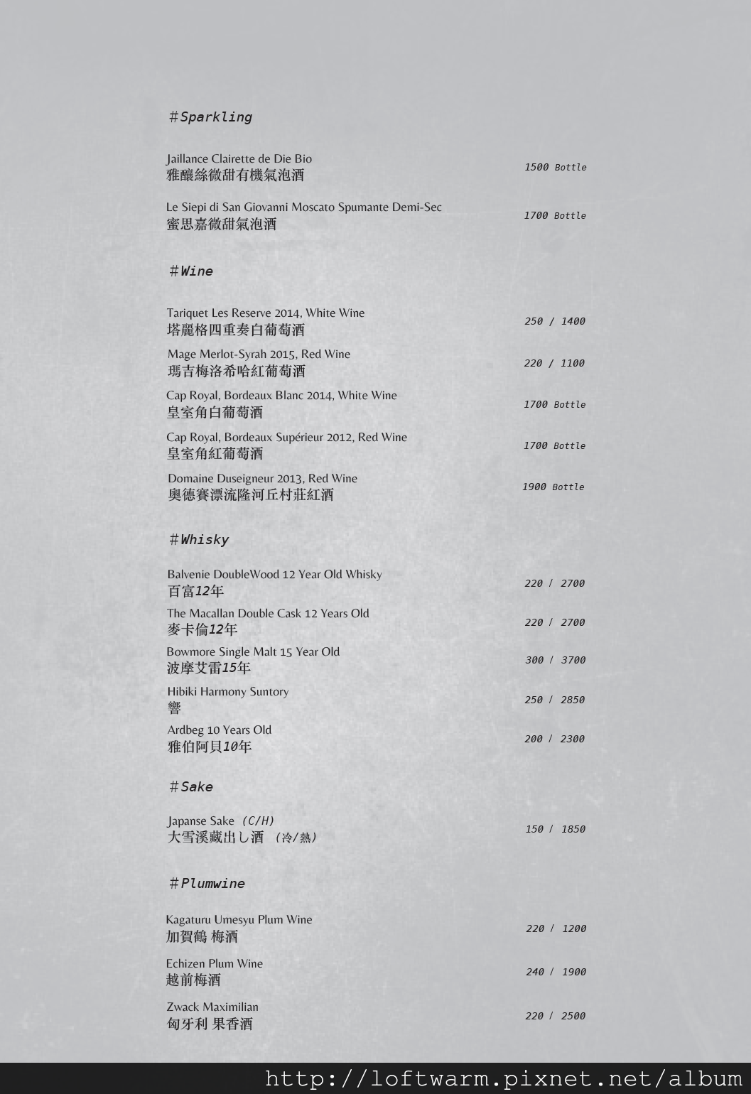 飲品有啤酒、氣泡酒、紅葡萄酒、白葡萄酒、紅酒、